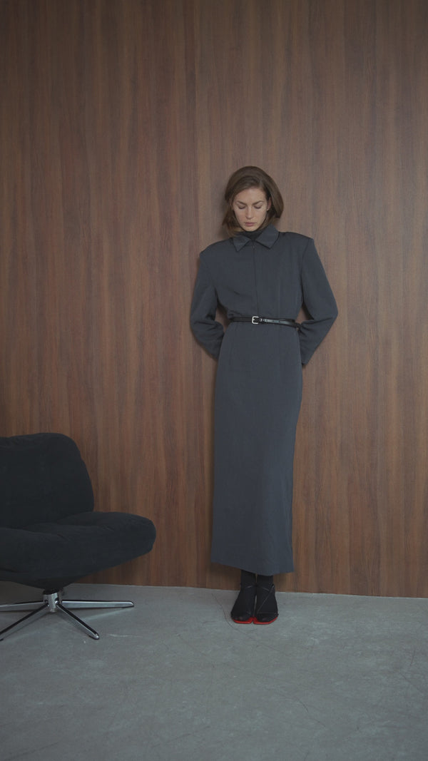 The Farida Dress is a refined take on power dressing, the ideal work dress crafted to bring elegance and comfort into perfect balance. With oversized shoulders and a softly cinched waist, the silhouette blends architectural strength with femininity. A front zipper and structured collar nod to utilitarian tailoring, while the midi length offers day-to-night versatility. Available in Black, Dark Grey, and Light Grey, Farida is a wardrobe foundation piece with sharp character and effortless appeal.