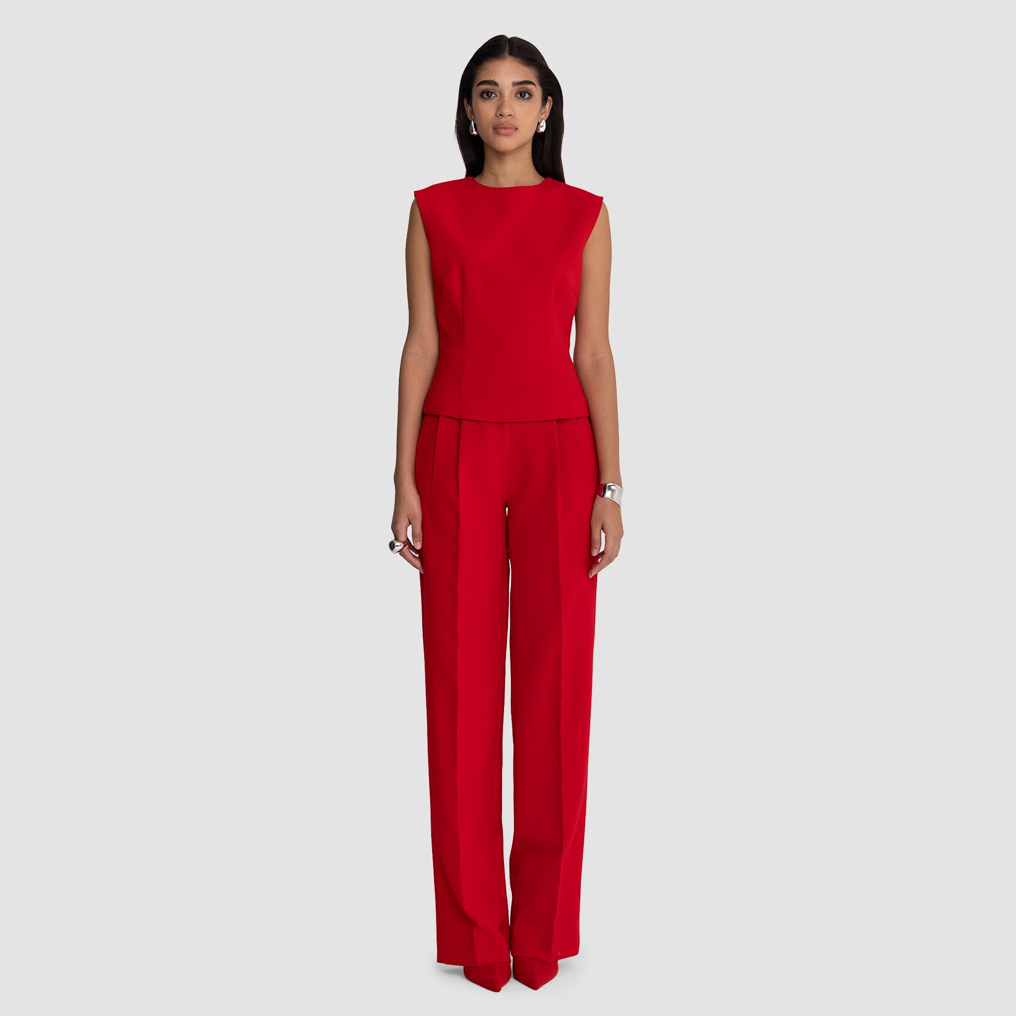 The Gabriele Trousers embody refined tailoring with a modern, elongated silhouette. Designed with a high-rise waist and a clean, structured line, these trousers offer a timeless yet contemporary presence. The straight, wide-leg cut creates an elegant flow while maintaining sharp precision through the front pleats and tailored finish. Crafted in a vivid red hue, the Gabriele Trousers bring bold sophistication to both coordinated sets and standalone looks, making them a versatile foundation for elevated dressing.