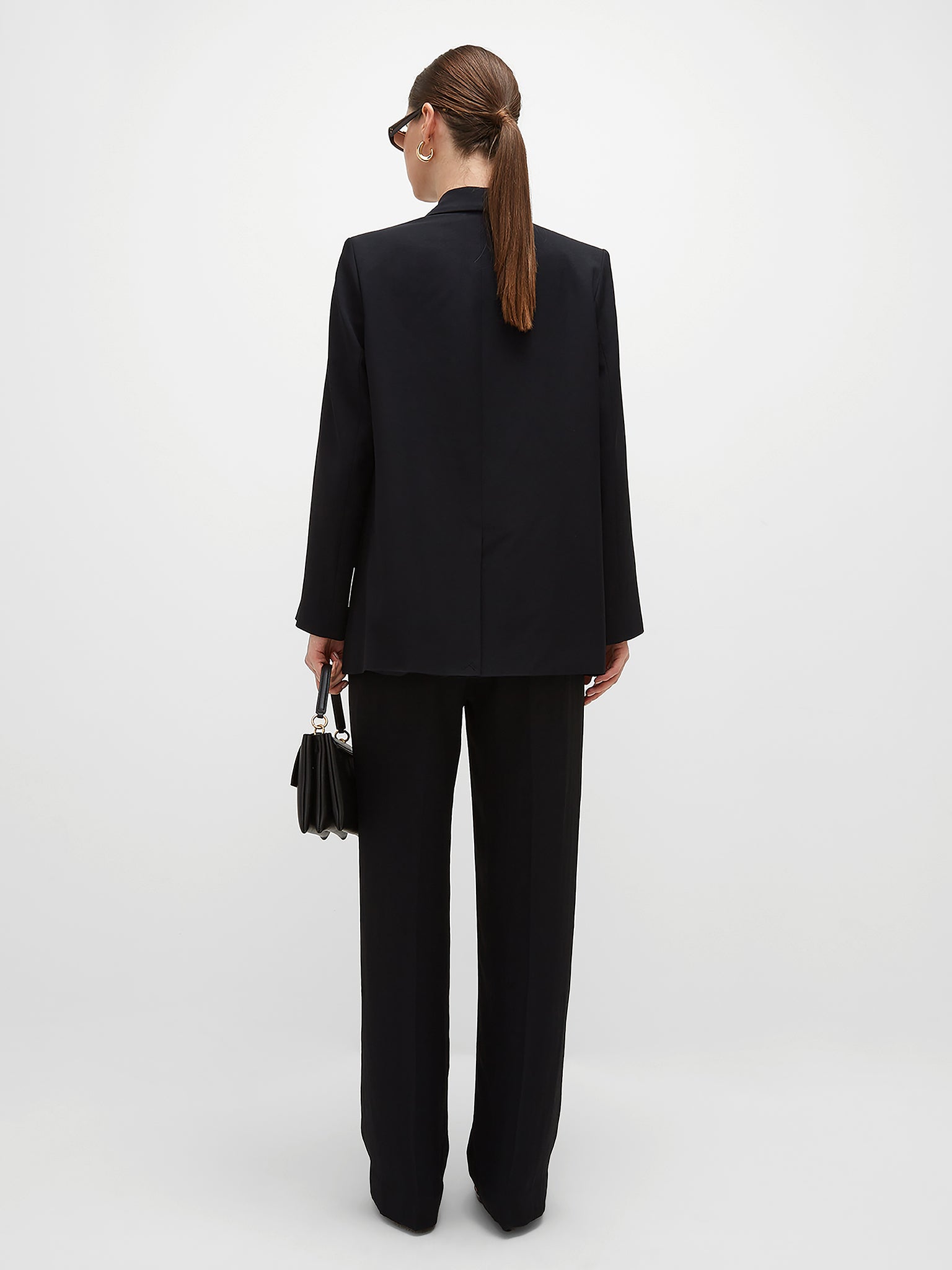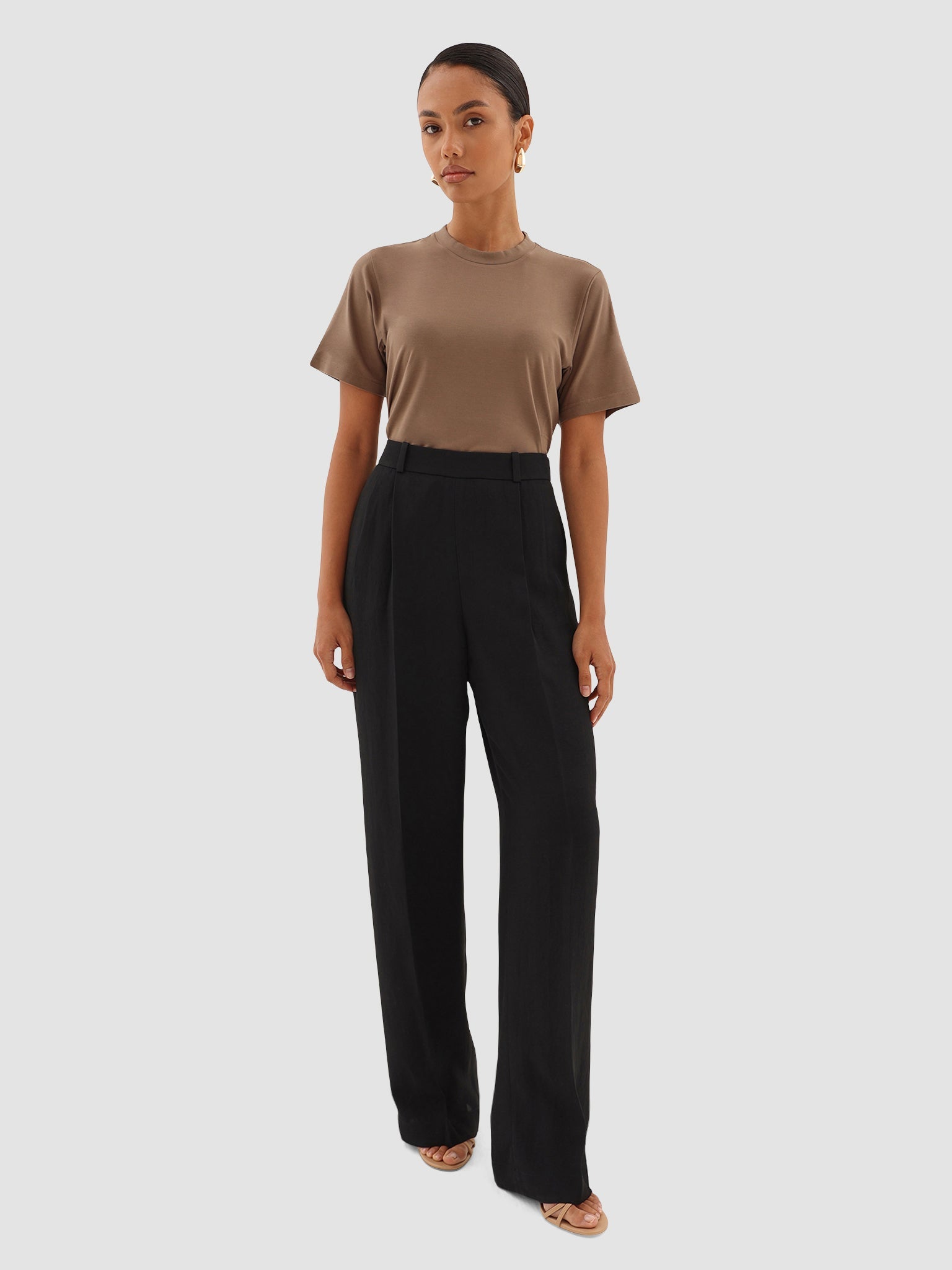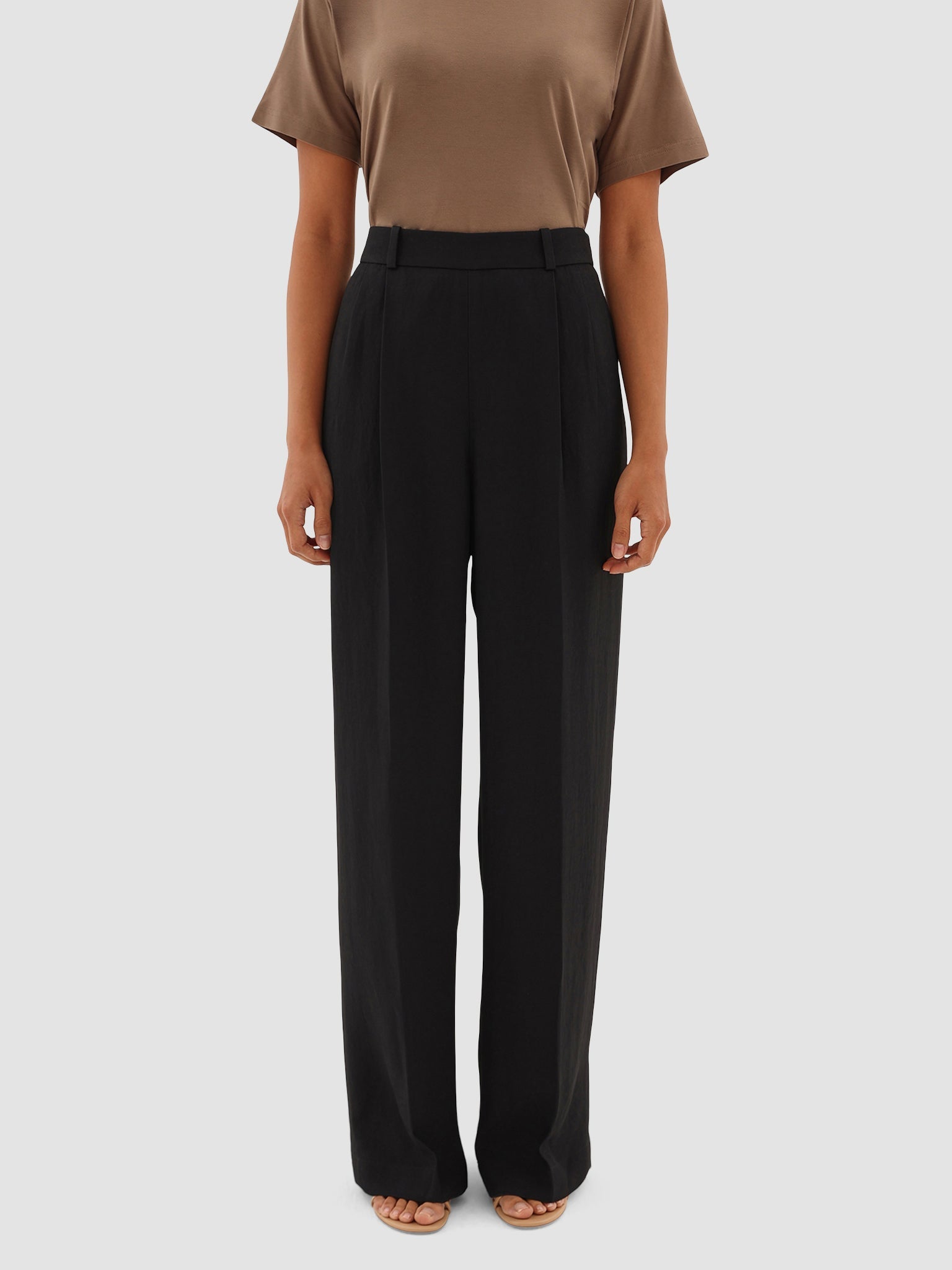 Tailored to perfection, designed to move. Crafted in UAE from luxurious sustainable crepe, these high-waisted straight trousers offer a sleek, elongated silhouette with a fluid drape that feels effortlessly refined. The front pleats add soft structure, while the flat front pockets keep the design clean and polished. A hidden side zipper closure ensures a seamless fit, making every step feel weightless.