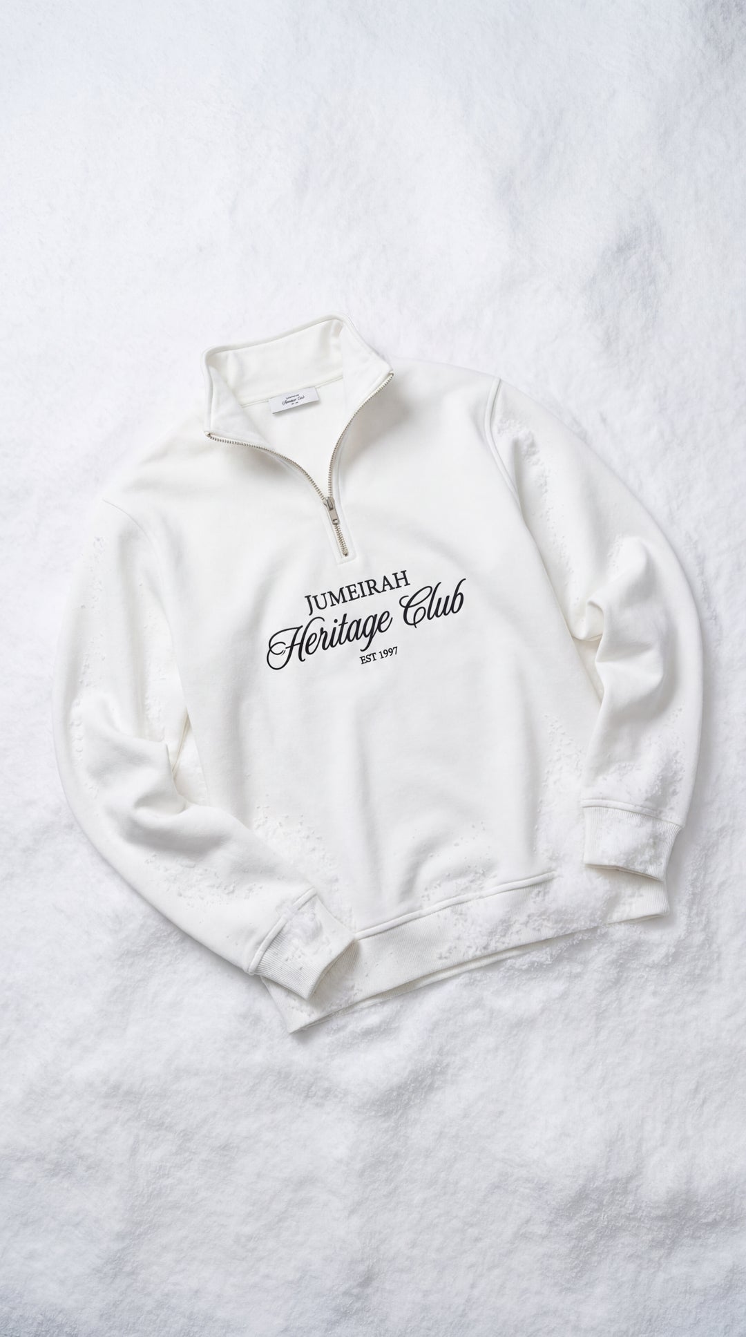 Part of the exclusive Jumeirah Heritage Club capsule, this unisex zip jumper captures the essence of quiet luxury and modern nostalgia. Crafted from refined cotton with a soft, structured finish, it features the Jumeirah Heritage Club logo in contrasting blue, a subtle nod to nostalgia, belonging and timeless simplicity. The high neck with a half-zip detail adds a functional, contemporary edge, while the minimalist silhouette embodies Bouguessa’s signature approach to effortless refinement. A limited-edition piece that reinterprets Dubai’s coastal heritage through a contemporary lens.