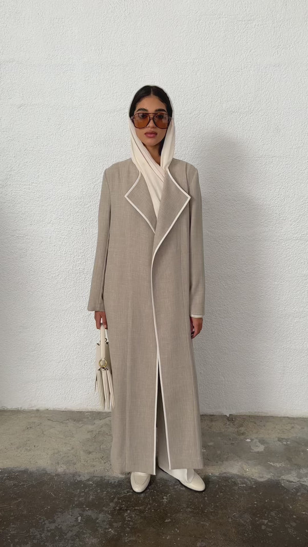 The Lena Long Trench is a refined, single-layer abaya-style coat designed for lightweight elegance and versatile layering. Its reversible construction and textured fabric lend richness to its effortless drape.