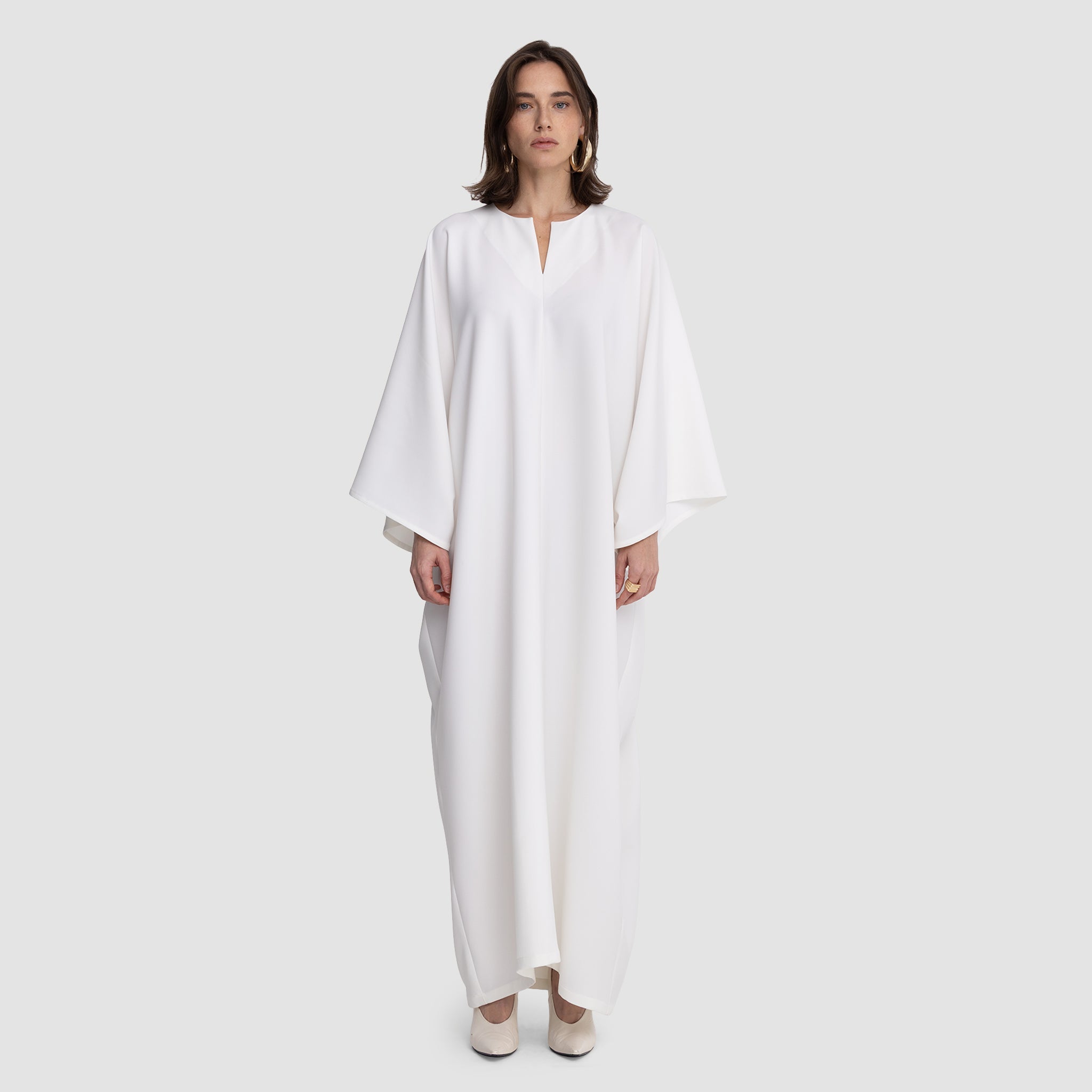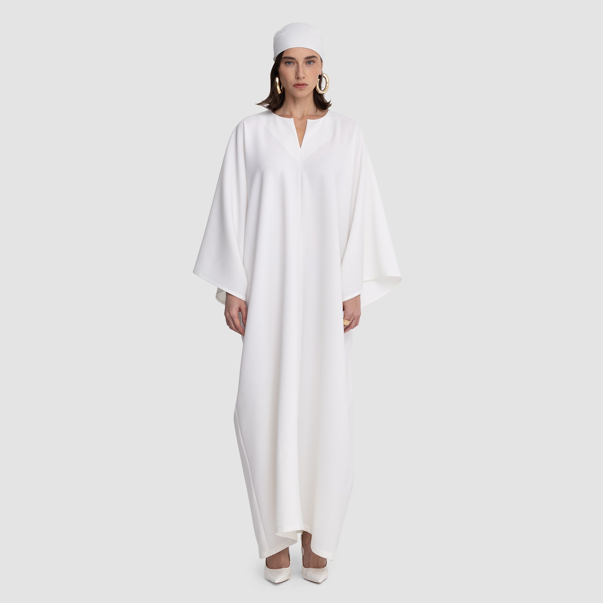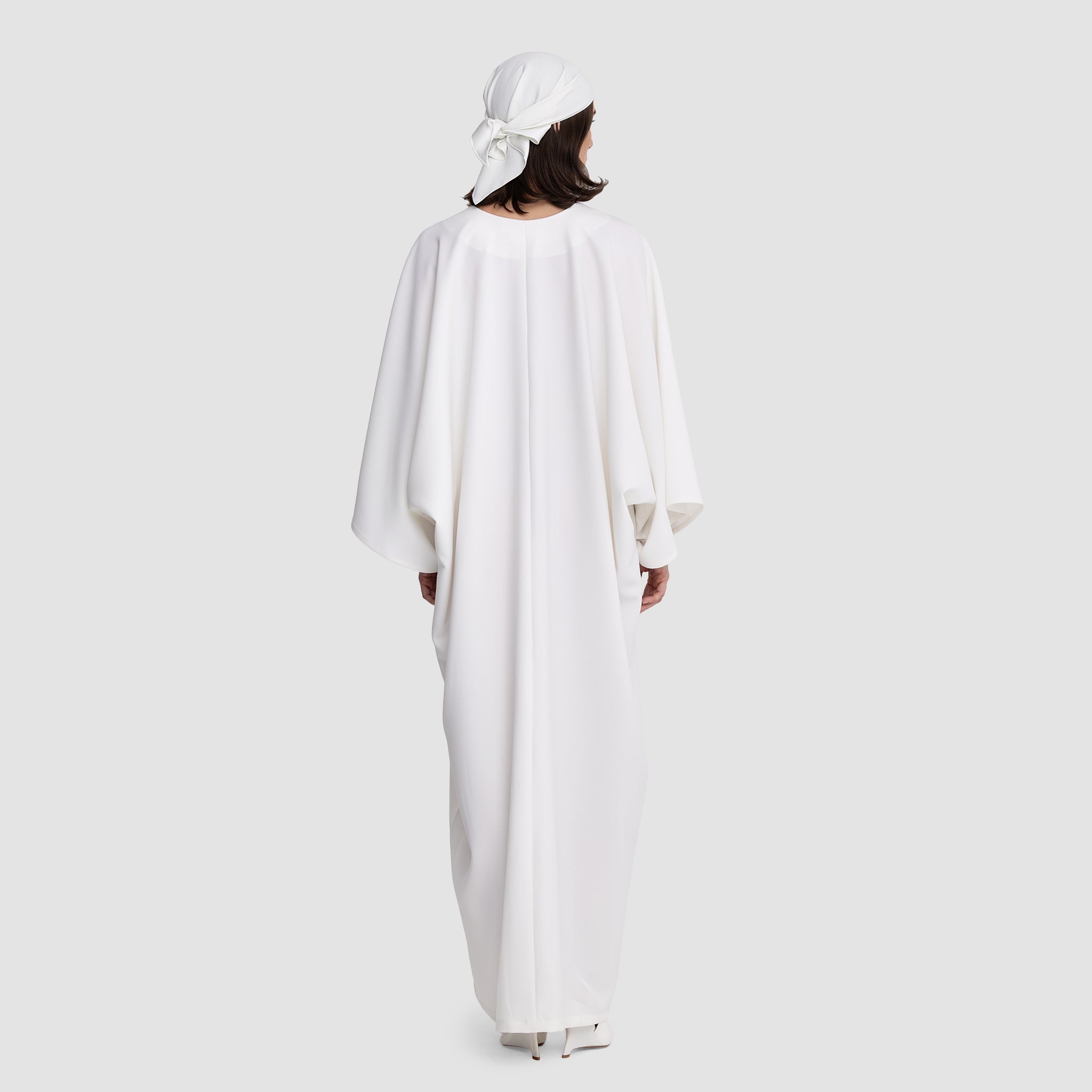 • Pair with bold gold jewelry to complement the kaftan’s sculptural lines.